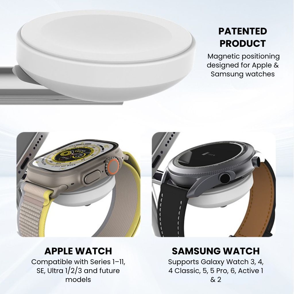 Easily power your phone, any watch, and earbuds with secure magnetic alignment.